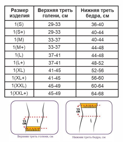 Размер бандажа выбирается согласно таблице подбора изделий по верхней трети голени и нижней трети бедра. Измерение снимается сантиметровой лентой на 15 см выше и ниже середины надколенника.